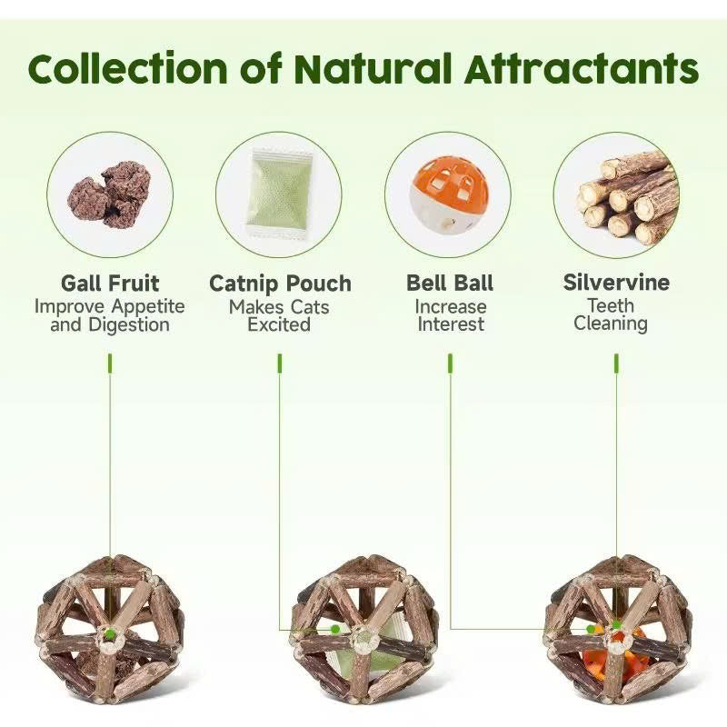 Yes! Each ball is made from natural silvervine sticks and hand-woven plant fibers. There are no chemicals, glues, or artificial materials. They’re safe for daily chewing and designed with curious cats in mind.